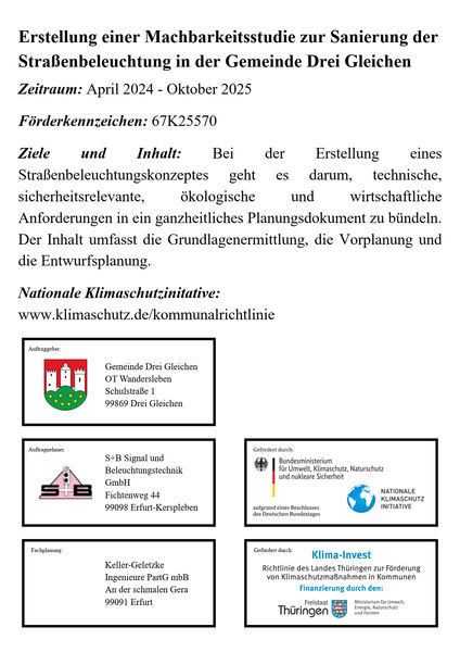 Von April 2024 bis Oktober 2025 wurde durch das Ingenieurbüro Keller-Geletzke in Zusammenarbeit mit der Firma S+B Signal und Beleuchtungstechnik ein Straßenbeleuchtungskonzept für die Gemeinde Drei Gleichen erstellt. Dieses ist nach seiner Fertigstellung Grundlage für die energetische Sanierung der Straßenbeleuchtung im Gemeindegebiet. Bereits in diesem Jahr wird die Gemeinde mit der Umsetzung einzelner Maßnahmen beginnen und so die Leuchtpunkte in allen Ortsteilen ökologisch und ökonomisch dem neusten Standard anpassen.