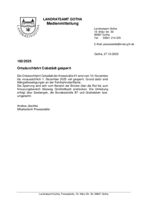 Sperrung Ortsdurchfahrt Cobstädt vom 10.11.2025 bis voraussichtlich 01.12.2025